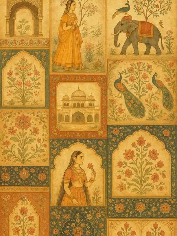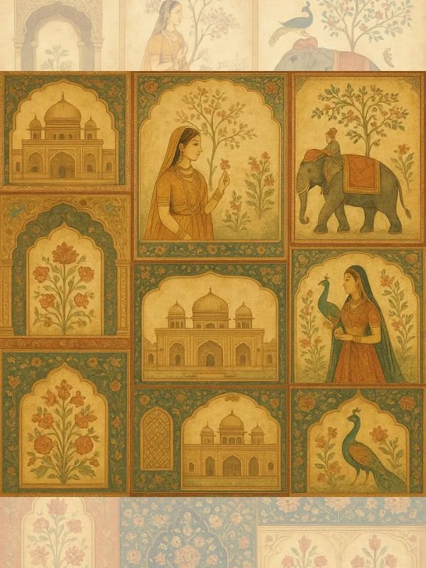 | Pattern Name : Luxurious Indian Heritage Wallpaper Collage in Mughal and Rajasthani Miniature Art Style Landscape |