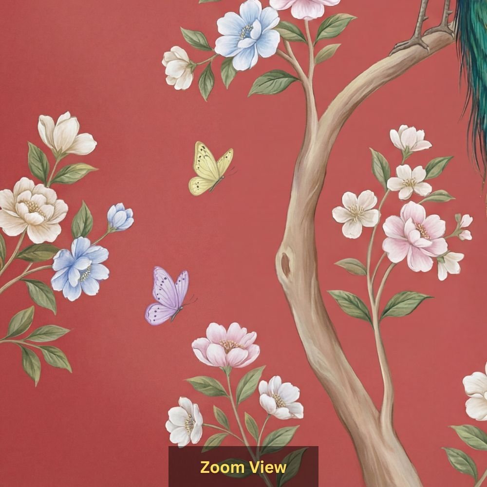 | Pattern Name : | Peacock Sitting on Tree Branch Wall Mural – Luxury Floral Wallpaper on Red Background |