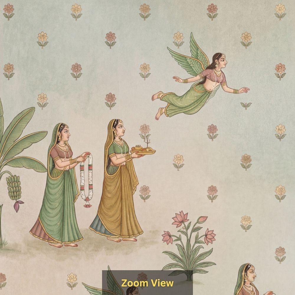 | Pattern Name : | Pichwai Pastel Wallpaper – Indian Miniature Art with Cows, Apsaras, Peacocks & Floral Motifs |