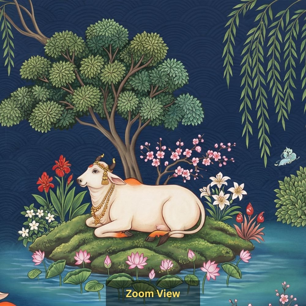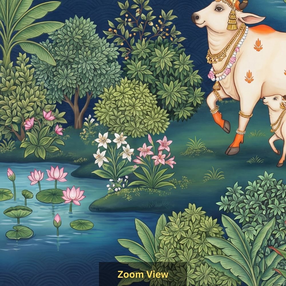 Sacred Cow and Calf Indian Miniature Style Wallpaper with Lotus Pond and Nature Motifs |